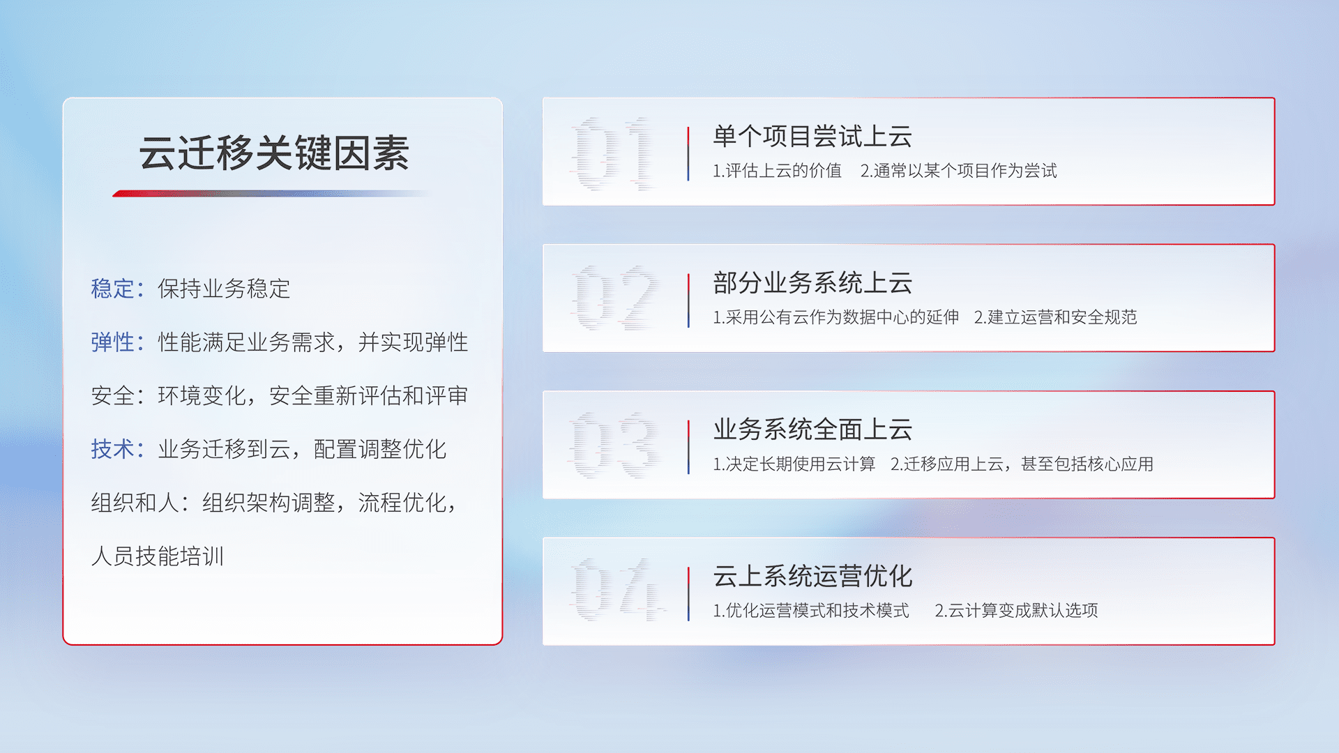 结合实际业务,,,,从规划设计、、云平台选型、、云原生改造、、、、数据迁移、、、、集成交付,,,,迁移全过程为客户识别最佳上云路径,,,,做好风险识别管理,,,,设计网络架构、、身份权限、、、、安全审计合规、、操作审计、、日志审计、、、、监控告警策略、、、多站点容灾设计等,,,,对云上基础设施进行整体规划,,提升IT治理水平,,以满足弹性、、、高可用、、、、高性能的需求。。。。